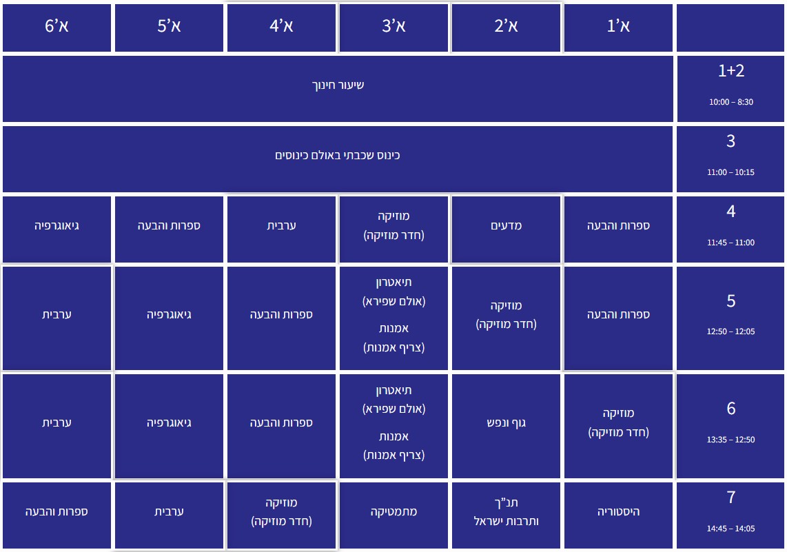 השיעורים מתקיימים בכיתת האם, אלא אם צוין אחרת.
